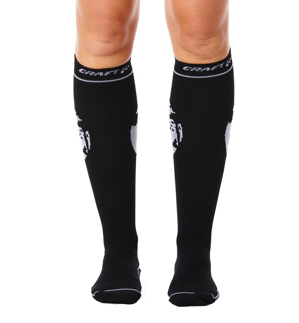 Sock with tight compression fit, pre-shaped arch ribs and wide elastic cuffs.